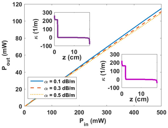 It is worth noting that by decreasing the design pump powers (440, 150, and 90 mW), the maximum coupling coefficients are decreased (261, 234, and 221 m−1), whilst the PPS positions are increased (1.7, 1.9, and 2 cm). Solving Equations (12)–(14), we calculate the output power versus various pump powers up to 500 mW, as depicted in Figure 6, considering the three coupling-profiles for different losses which are shown in Figure 5b and the insets of Figure 6. For given losses of 0.1, 0.3, and 0.5 dB/m, at the design pump powers, the DFB output powers are 101.3 mW, 34.1 mW, and 19.4 mW, and the DFB lasers have linear output/input power characteristics with the slopes of 23.1%, 22.3%, and 22.1%, respectively.