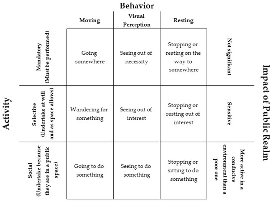 As discussed above, streets are not merely thoroughfares that connect one point with another. As illustrated by Figure 1, the public perform a wide range of activities in streets that can be categorised as (i) mandatory (e.g., going to work or school and shopping), (ii) selective (wandering or sitting and watching street life), and (iii) social activities (having conversations) while human behaviour in streets can be classified as (i) moving, (ii) visual perception, and (iii) resting behaviours, which can occur discreetly, successively, or concurrently [14]. As such, it is a public realm that is actively and passively consumed depending on how it is structured as a public space. These structures highly influence the norms for how such a space is moved through and consumed by individuals or groups [15].