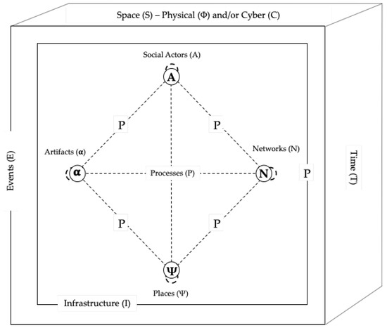 In this framework, five core entities are identified and defined: Social Actors, Artifacts, Networks, Places, and Infrastructure: