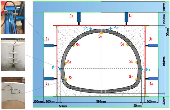 The earth pressure sensors P1, P2, P3 and P4 were, respectively, fixed at the left arch waist, the left side of the arch, the right side of the arch and the right arch waist on the surface of the lining structure and connected with the DH5956 dynamic signal test and analysis system. The accurate loading of the tunnel lining structure was achieved based on the readings of the earth pressure sensor. The lower parts of the jacks were in contact with the reaction frame, and the model was loaded by the reaction force provided by the frame.