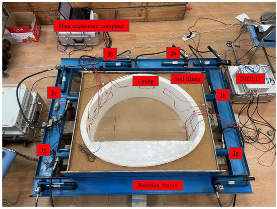 The loading system consists of a pressure jack and a reaction steel frame, as shown in Figure 4. The test jacks were FCY-10100 hydraulic jacks, and the specifications were 10T horizontal loading hydraulic jacks. Each jack was equipped with a CP-180 manual pump, 1.5-m oil pipe and a pressure gauge. The vertical uniform pressure on the lining structure was simulated by jacks J3 and J4 located at the vault of the tunnel lining model. The horizontal distribution pressure on the tunnel lining structure was simulated by J1 and J2 on the left side of the tunnel lining and J5 and J6 on the right side of the tunnel lining. The jacks converted the point load into a uniform load to act on the lining structure of the tunnel through the 1cm thick steel plate at the front end and the silty clay medium between the steel plate and the lining structure.