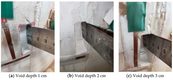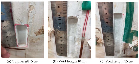 In working conditions 2, 3 and 4, a void with a depth of 1 cm, a void with a depth of 2 cm and a void with a depth of 3 cm were successively installed on the outer wall of the vault, as shown in Figure 7a–c. In addition, seven groups of strain gauges were affixed to the left wall, left arch waist, left arch shoulder, vault, right arch shoulder, right arch waist and right wall in the inner side of the lining structure according to the scheme, and one group of strain gauges was affixed to the void of the outer wall. The pressure system was controlled to slowly pressure the lining until the vault pressures P2 and P3 both reached the vertical distribution pressure q of 0.263 MPa, and the arch waist pressure P1 and P4 on both sides reached the horizontal distribution pressure e of 0.132 MPa, and the pressure was stopped.