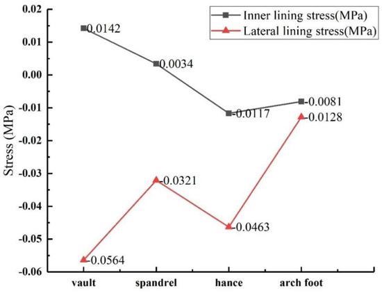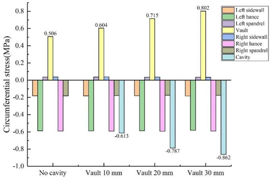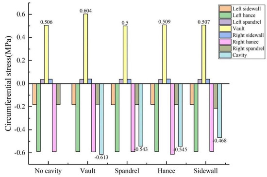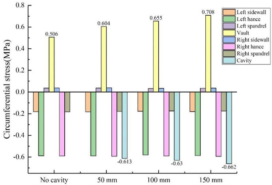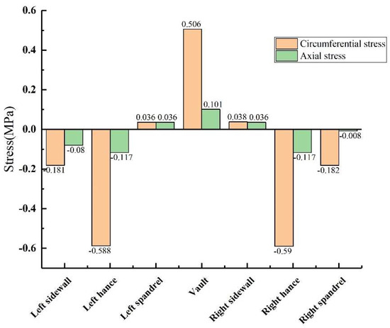 When there was no void behind the lining, the external surface of the lining was under pressure, and the internal surface was under positive tension (the same below). Figure 9 shows that under the condition of no void defect, the stress values of the lining vault and the arch shoulder are positive tensile stress, while the stress values of the arch waist and the arch foot are negative compressive stress. However, whether it was tensile stress or compressive stress, the circumferential stress was generally greater than the axial stress at the same monitoring point. The inner circumferential tensile stress of the vault was 0.506 MPa, and the inner axial tensile stress was 0.101 MPa. The peak values of circumferential and axial tensile stresses appeared at the vault, while the peak values of circumferential and axial compressive stresses appeared at the arch waist, which can explain why the inner wall of the vault was mainly damaged by tensile stress, and the inner wall of the arch waist was mainly damaged by extrusion.