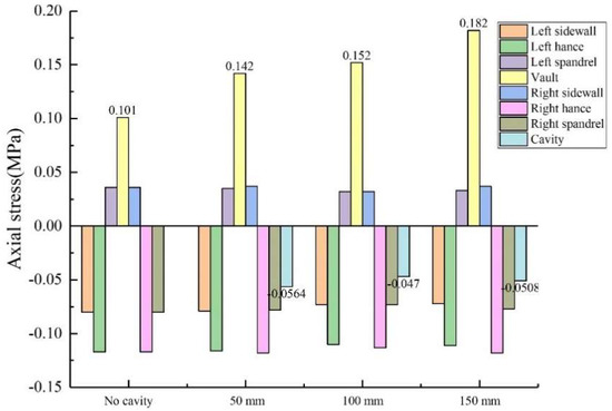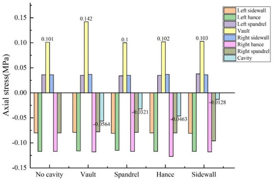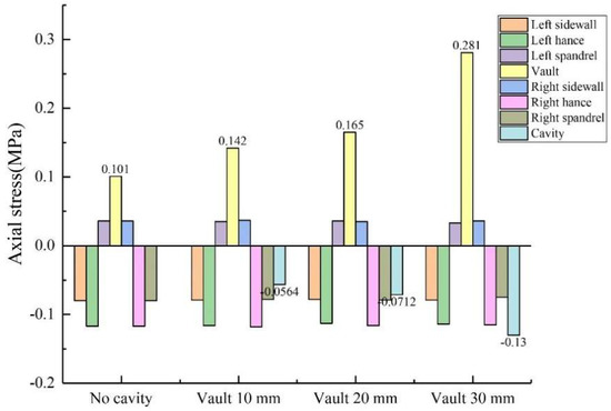 The size of the void was controlled to be 50 mm × 20 mm × 10 mm (length × width × depth), and the positions of the void behind the lining were transformed into vault, arch shoulder, arch waist and arch foot in order to obtain the circumferential and axial stress values at different positions of the lining, as shown in Figure 10 and Figure 11. (1) When the void was located at the vault, the circumferential tensile stress of the vault was 0.604 MPa, which increased by 19.37% compared with the condition without the vault void. The axial stress of the inner wall was 0.142 MPa, and the increase was 40.59% compared with that of the vault without void. When the void was located at the arch shoulder, the arch waist and the arch foot, compared with the lining without the void, the circumferential and axial stress values of the lining did not change much at the same monitoring position. It shows that the void has the greatest influence on the stress of the lining structure when it is located at the vault but has little influence on the stress of the lining structure when it is located at other positions. (2) When the voids were located at the vault, shoulder, waist and foot, the circumferential stresses at the void were −0.613 MPa, −0.543 MPa, −0.545 MPa and −0.468 MPa; the axial stresses were −0.0564 MPa, −0.0321 MPa, −0.0463 MPa and −0.0128 MPa. According to the test data, with the change of the location of the void, the stress value of voids in the descending order was: arch > arch waist > arch shoulder > arch foot. The presence of void disease will lead to different degrees of increase in axial force and bending moment near the void position.