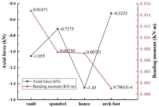 The variation law of axial force and bending moment of the structure can be obtained by using Formulas (3) and (4), as shown in Figure 17. It can be seen from the figure that the axial force variation law of the lining structure was similar to the stress variation law of the outer lining void, and the maximum value was located at the arch waist. The bending moment in descending order of arch vault > spandrel > hance > arch foot, and the maximum bending moment of the lining structure was located at the vault.