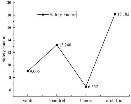 The lining safety factor can be obtained by using Formula (5). The variation law of the lining safety factor with void position is shown in the Figure 18, and its variation law is similar to the lining axial force. All safety factors are greater than two, meeting the requirements of safety standards, which are in descending order: arch foot > spandrel > vault > hance.