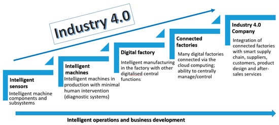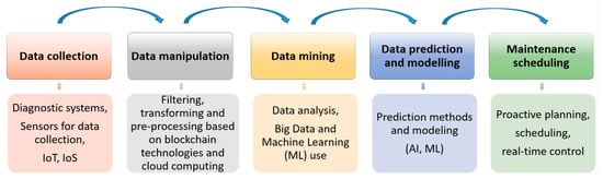 Smart production is designed based on a modular structure, where production facilities and logistics systems are organized without human intervention [58]. Production is supervised using a number of intelligent sensors, cameras, and indicators. Where information is not exchanged online, data are stored in the device’s memory and exchanged on demand. In addition to data on the condition of the product itself, data on the condition of the machinery and equipment operating in the factory are also collected [59,60]. The collection and analysis of this data lead to the Maintenance 4.0 concept, which is described in detail in Section 2.3 [61].