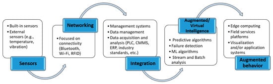 Based on the presented developments in the implementation of Maintenance 4.0, it can be concluded that this approach allows the design and implementation of so-called self-aware (self-diagnose) and self-service (self-service) equipment systems that can self-assess their technical condition and degradation process and use information from other machines to make intelligent maintenance decisions [60]. The Deloitte report classifies the technologies that underpin PdM 4.0 under five categories [53]. These are sensors, networking, integration, augmented intelligence, and augmented behavior (Figure 7).