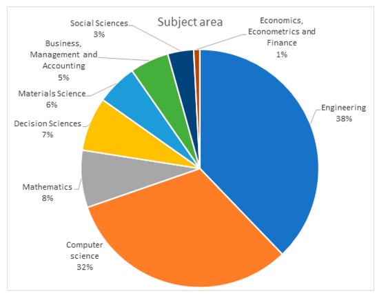 An analogous bibliometric analysis was carried out for publications included in the Scopus database. The first stage of the study identified 24,603 relevant records (searching by Maintenance 4.0 keyword and filtering by “all fields”). Subsequent filtering by “abstract/title/keywords” reduced the number of records searched to 3747 publications. In the final step, the analysis was again narrowed down to publications from 2013-2023, and only texts in English were included. Non-topically related publications were also excluded. Indeed, the filtered subject areas also have been related to the production/logistic/maintenance issues. Therefore, subjects such as medicine, mathematics, energy, biochemistry, genetic and molecular biology, chemistry, or nursing were excluded from further analysis.