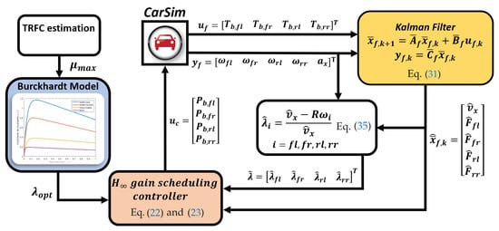 As shown in Figure 1, a Kalman Filter algorithm is used to estimate the braking tire force of each wheel and the longitudinal velocity of the vehicle. These estimations are then used to calculate the longitudinal slip on each wheel and for the model used by the controller. To simplify the algorithm, the TRFC is supposed to be obtained by some estimation method [20,21,22,23,24,25,26,27,28,29,30,31,32] and the optimal tire slip that maximizes the braking force is calculated by means of the Burckhardt friction model. Finally, the controller generates the necessary braking pressure for each wheel in order to minimize the error between the optimal and current longitudinal slip.