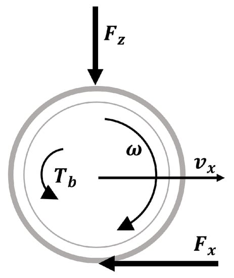 where J is the moment of inertia of the wheel, m is the equivalent mass of the single-corner vehicle model and R is the effective radius of the wheel; is the rotational velocity of the wheel, is the braking torque applied on the wheel, is the longitudinal velocity of the vehicle and is the force originated from the tire–road contact. This force can be determined by means of the expression