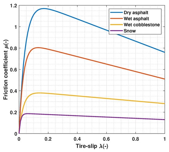 where the value of the coefficients , and only depends on the road condition, resulting in different friction curves [34], as in Figure 3.