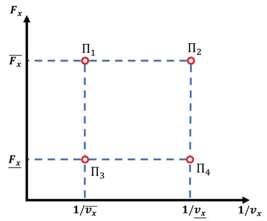 The limit values for parameters and are defined in Table 2. The velocity range considered is . The minimum force on the tire is 0 N, and the maximum for the front occurs when the friction coefficient is maximum, considering load transfer. For the case of the rear tire, the maximum forces are calculated when only static load is considered