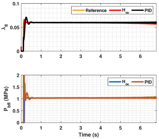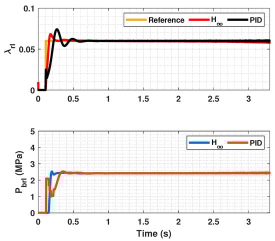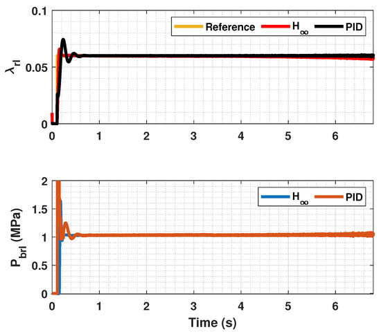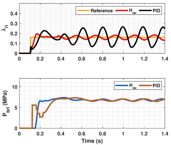 In addition, another constraint is used to limit the maximum control output signal so that the maximum pressure supported by the hydraulic system is not exceeded, thus limiting the braking torque. The limitation of the output signal is performed as in [37], where given positive definite matrices Q and M and a positive scalar , the maximum control output of the system in Equation (9) can be limited using the constraint