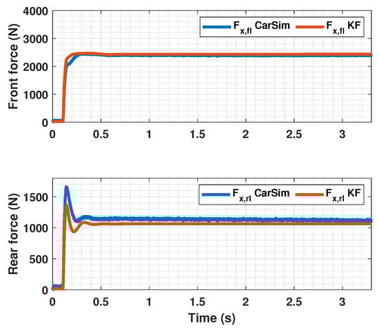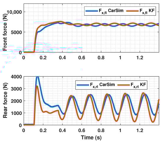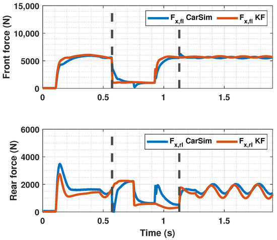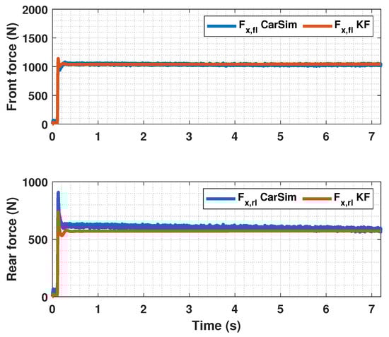 where the state variables are , and the control inputs are , which can be known by means of the controller signals. The measurements are the longitudinal acceleration of the vehicle and the wheel rotation speeds, . All the measurement signals can be obtained using inertia or velocity sensors. Longitudinal acceleration can be measured by an Inertial Measurement Unit (IMU) [39], while the angular velocity of each wheel can be measured with Wheel Pulse Transducers (WPTs) [40]. Even though longitudinal velocity can be measured with an odometer, this can lead to imprecise results; therefore, an estimation of seems to be the best choice. By augmenting the system with the tire forces, the new state-space variables vector is , and the state equation of the KF written in discrete form is