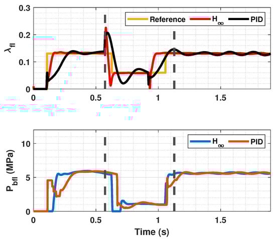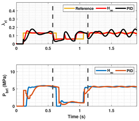 In Figure 14, Figure 15 and Figure 16, a snowy stretch on the road where the vehicle brakes is simulated. It can be seen that when the sudden friction change occurs, the controller prevents the slip from increasing too much and thus stopping the wheel from locking. In addition to that, the controller makes the slip of both the front and rear tires follow the reference , even though the tires of each axle enter the snowy section at different time instants. The entering and the exit of the car from the snowy patch is pointed out in Figure 14 and Figure 16 with discontinuous lines. Again, the proposed controller performs better than the PID controller, as it has a faster response and minimizes error further.