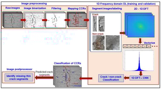 In the overall approach, we first generated CCRs using image processing, wherein adaptive-threshold-based integral image binarization was employed. A large portion of the CCRs arising from shot noise, surface texture, and statistical features associated with image binarization were filtered using the geometric properties of cracks, such as eccentricity and area-based criteria. Next, we mapped the rectangular bounds of filtered CCR segments derived in the binary pixel space to the raw image space (red-colored bounding boxes in the image processing (Figure 3)). Subsequently, the bounding boxes from the raw image were separated from the background and labeled ‘crack’ and ‘non-crack’ for supervised learning. These segmented images of cracks and non-cracks were transformed to a Fourier basis space using 2D DFT and vectorized to 1D to reduce the dimensional complexity. The vectorized DFT was fed as an array input to the 1D DL model. Using the DL model, we extracted discriminant features and classified CCRs as either cracks or non-cracks. The segmented CCRs classified based on the 1D DL model were mapped to the original raw image using the original bounding box coordinates, which were carried forward from image preprocessing to classification CCRs in the original raw image. This approach is sufficient irrespective of the size of the segment. The corresponding classified CCRs were mapped onto the raw images. Although the implementation scheme is similar to the bounding-box-based approach, the outcome is equivalent to semantic segmentation, where we perform pixel-level classification of structural features in a computationally efficient manner by combining image processing with a 1D DFT-CNN. The nonuniform size of CCRs enables scalability, irrespective of the size of the image.