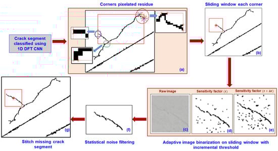 Figure 4. Algorithm for 1D DL-assisted image processing for identification of thin propagating cracks post DL-based crack and non-crack classification. (a) Identify endpoints of pixelated residue in the crack segments that the 1D DFT-CNN model classifies (markers indicates the endpoints of pixelated residue; red color rectangle is the bounds of the pixelated residue; circle indicates region of zoom window). (b) Define sliding window (red color square) with each endpoint (red star marker) as the centroid of the window. (c) Map and extract the corresponding sliding window in the raw image. Adaptive integral binarization on sliding window with (d) original sensitivity factor ( t ) and (e) differential sensitivity factor ( t + Δ t ) . (f) Filtered sliding window using geometric properties of crack. (g) Stitch sliding window in pixelated image to connect missing segments of crack.