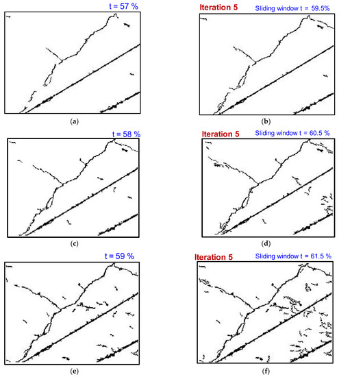 Figure 8. Effect of initial threshold percentage on tracking thin shallow cracks (a) t = 57   % , (c) t = 58   % , (e) t = 59   % . (b,d,f) Tracking missing thin crack segments after 5th iteration for corresponding pixelated residue with an initial threshold sensitivity parameters as shown in (a,c,e). Note: Δ t for each iteration is 0.5 %.