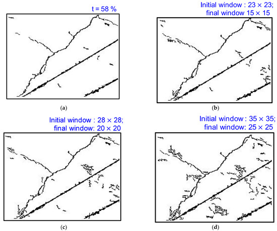 Despite the promising results, it is noteworthy to discuss the effects of various parameters on integral image binarization contributing to the final results, including (a) the effect of the initial threshold percentage (Figure 8) (b) the effect of the initial window size on tracking thin shallow cracks (Figure 9). Moreover, one limitation is that when the crack segment is close to the non-crack segment, the sliding window from the crack segment also searches for thin cracks or shallow features from the non-crack regime, which is undesired and requires additional filtering. This will be addressed in future studies. Another limitation of the proposed scheme is the misrecognition of disturbances, in addition to the detection of tiny cracks. Future work will focus on retaining the tiny cracks and filtering additional disturbances by combining the outputs of the DL model and the proposed research.