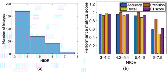 For the chosen database with a wide range of optical variabilities, environmental uncertainties, and surface texture variability, we quantified the quality of each image using a baseline-free indicator—natural image quality evaluation (NIQE) [69]. NIQE predicts deviations/artifacts in image statistics arising from optical and surface variability. Figure 11a presents the optical image quality quantified using the NIQE histogram. The quantitative range of the NIQE is 3–8; a low NIQE metric implies the best perceptual quality, with minimal undistortion. Ideally, we anticipate a reasonably high accuracy within the database uncertainty range or variability and a decrease for any unaccounted effects. However, the performance metrics deviate from the anticipated trend beyond the NIQE metric > 6 (Figure 11b) because of the skewed unbalanced dataset. The performance metrics of the proposed scheme are consistent for the NIQE range ≤ 6.