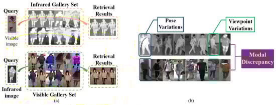 Visible-infrared person re-identification (VIPR) [1,2,3,4,5,6], as illustrated in Figure 1a, is important in smart city constructions because it can help find suspicious persons from massive traffic videos. As shown in Figure 1b, VIPR not only suffers from pose variations and viewpoint variations that commonly exist in traditional person re-identification [7,8,9,10] based on visible images but also encounters a huge modal discrepancy between visible and infrared images. The huge modal discrepancy is a serious challenge to VIPR because it leads to different identities of the same modality that are more similar than the same identity of different modalities. Therefore, how to to properly deal with modal discrepancies is crucial to VIPR.