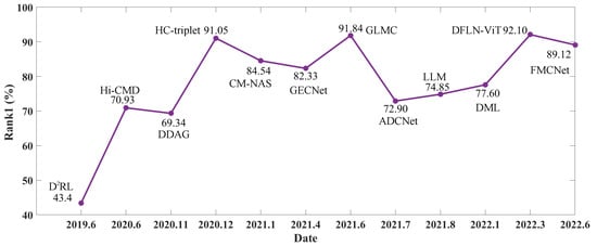 As shown in Figure 2, VIPR has been a hot topic in the past three years and has progressed remarkably. For example, the DRL method [31] acquired a 43.4% rank-1 accuracy in 2019, the Hi-CMD method [19] gained a 70.93% rank-1 accuracy in 2020, and the DFLN-ViT [32] and FMCNet [33] methods obtained a 92.10% rank-1 accuracy and an 89.12% rank-1 accuracy, respectively, in 2022. The huge modal discrepancy of visible and infrared images are still a great challenge for VIPR; recent methods mainly focus on two aspects: (1) feature alignment and (2) adversarial conversion. A more detailed survey follows.