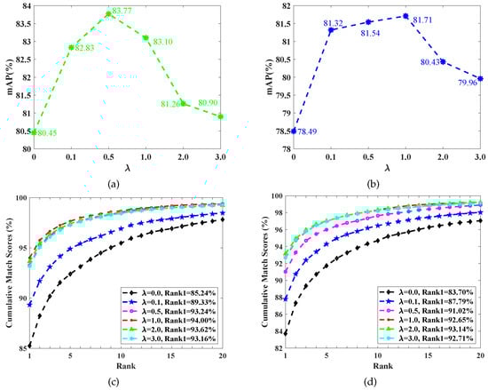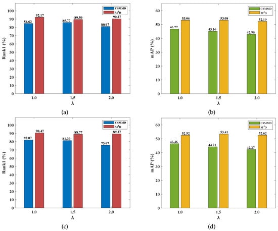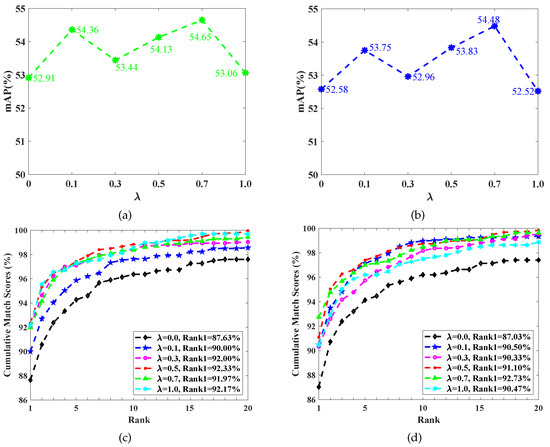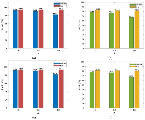 Since the MD loss function is responsible for the learning modal-invariant features and in Equation (7) controls the weight of the MD loss function, we adjust the value to analyze the role of the modal discrepancy suppression. The results are shown in Figure 6 and Figure 7.