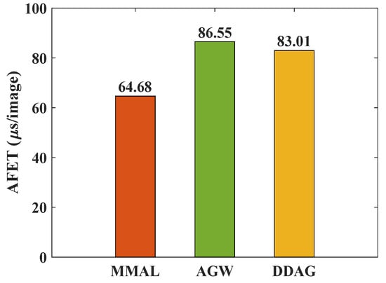 Due to feature extraction costs of the higher inference times, following [76,77,78], we apply the average feature extraction time (AFET) per image as a running time indicator. The smaller the AFET per image, the better the running time performance would be. As shown in Figure 8, our MMAL method acquires the best AFET per each image performance. To be more specific, our MMAL method’s AFET per image is 21.87 s smaller than that of the AGW [38] method and 18.33 s smaller than that of the DDAG method [35]. The reason for this that both the AGW and DDAG methods apply a partial two-branch backbone, which is more complex than the single-branch backbone used in our MMAL method.