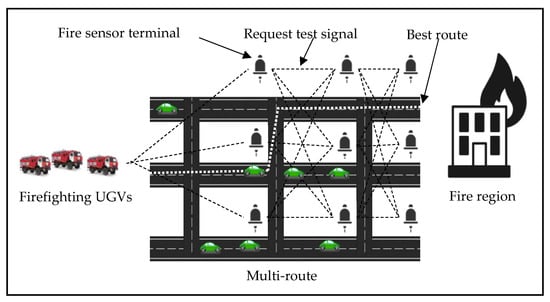 The source UGV transmits a routing request to the ST after picking the intersection information for the source and destination. In the case of the DT information, it is available at the ST and is not out of date, the ST responds to S with a positive message; otherwise, the ST responds with non-active message then searches for the best tracking path. To determine the potential tracking route from the ST to DT, the ST sends a set of forwarding signals through the road’s fire sensor, with the number of forwarding signals set to the UGV. Whenever a forward signal arrives at the fire sensor intersection Ii, it saves the transmission throughput before making a random choice to select, depending on the throughput, the next intersection recorded at Ii, assuming that Ii has K surrounding crossings, namely I1, I2,..., IK1, IK. The probability pij with the firefighting UGV picks the next “Ij”, which is illustrated in Equations (9)–(11). When a forward signal from a firefighting UGV arrives at the DT with a delay of less than the Dth, the firefighting UGV’s path is selected as an available candidate route [].