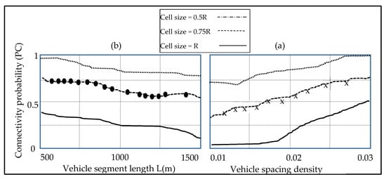 Figure 3a,b show how the road segment length L, cell size cs, vehicle distance density, and communication range R affect the road segment probability. Figure 3a shows the upper and lower bounds of the road segment connectivity for cs = R and cs = 0.5 R. Accordingly, the average analytical results (CI = 95%) closely match the simulation results for cs = 0.75 R. We set L = 1500 m and cs = 0.75 R in Figure 3b, and we notice that the mean analytical findings match the simulation model for all Rs. The packet delivery ratio of the road segment is adjusted at λ = 0.015 vehicles/m in Figure 4a, the mean distance between the theoretical and simulation results is only 4.85%, in the case of cs = 0.75 R. Furthermore, as the distance of the road segment increases, so does the ratio of the packets delivered, since more transmission hops are necessary. Moreover, when the interference percentage is reduced due to less interference from the surrounding nodes, the packet delivery rate increases.
