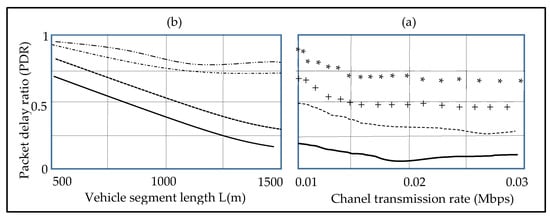 Road segment packet delivery ratio, depends on the channel transmission rate. (a) the mean distance between the theoretical and simulation results is only 4.85%, in the case of cs = 0.75 R. Furthermore, as the distance of the road segment increases, so does the ratio of the packets delivered, since more transmission hops are necessary. (b) depicts the packet delivery ratio model’s availability with the varied vehicle separation density, packet size, and the channel transmission rate (CTR).