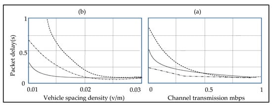 Figure 4b depicts the packet delivery ratio model’s availability with the varied vehicle separation density, packet size, and the channel transmission rate (CTR). As anticipated, as the CTR increases, the delivery ratio of the packet decreases, resulting in an increased BER, and a lower SINR. Furthermore, as the vehicle distance density grows, the ratio of the packet delivery increases also. This is due to the fact that the increasing UGV spacing density enhances the network connectivity, forcing the data packets to be routed mostly over wireless communications, which causes more interference from the wireless channel decaying. Figure 5a,b depict the relationship between the road section delay, cell size, CTR, and the spacing density of the UGV.