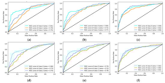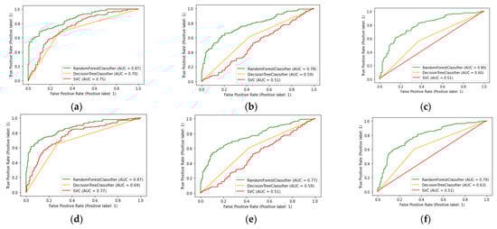ROC curves of classification models of each SVD element and real and imaginary components: (a) ROC curves of real components of SVD U element; (b) ROC curves of real component of SVD VT element; (c) ROC curves of real component of SVD S element; (d) ROC curves of imaginary component of SVD U element; (e) ROC curves of imaginary component of SVD VT element; (f) ROC curves of Imaginary component of SVD S element.