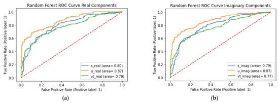 ROC curve of classification of healthy and COPD classifications of each signal component and SVD elements: (a) Chart of the ROC curve of the RFC for real components on the classification of Healthy and COPD in the first panel; (b) chart of the ROC curve of the RFC for imaginary components on the classification of Healthy and COPD.