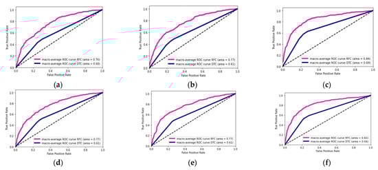 DTC and RFC classification of Healthy, COPD, and Pneumonia for each SVD element and real and imaginary components of the signals: (a) ROC curves of real components of SVD U element; (b) ROC curves of real component of SVD VT element; (c) ROC curves of real component of SVD S element; (d) ROC curves of imaginary component of SVD U element; (e) ROC curves of imaginary component of SVD VT element; (f) ROC curves of imaginary component of SVD S element.