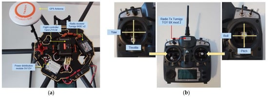 Variant v1 of the hexacopter. (a) Equipment; (b) Radio control.