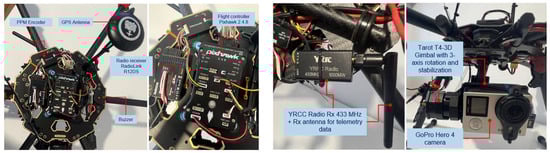 Figure 2 depicts the second version of the hexacopter, composed of the flight controller AP Pixhawk 2.4.8 sensor, a PPM protocol encoder sensor that allows the encoding of eight signals using the pulse width modulation (PWM) protocol in a single signal employing the pulse position modulation (PPM) procedure; loudspeaker, for AP status beeps; fail-safe on/off switch for protection against accidental starting of the motors; data transmitter telemetry transmitter YRRC at the 433 MHz frequency and 1000 mW power for the transmission of telemetry data on the ground, paired with the signals telemetry on the ground receiver, model YRCC, which transmits the video signal on 32 channels at a 5.8 GHz frequency; 600 mW power, for video signal transmission from the GoPro Hero 4 model camera mounted on the three-axis rotation gimbal, Tarot T4-3D model; a 12-channel RadioLink R12DS radio receiver; 2.4 GHz frequency for radio command reception from the transmitter built into the control box at the ground operator; GPS signal reception antenna; and the ReadytoSky model.