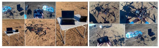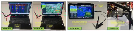 The two components of the telemetry kit are illustrated in Figure 7: the transmitter mounted on the drone and the receiver in two connection options (Samsung tablet and HP Omen laptop), on which the Mission Planner GCS was installed.