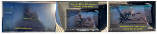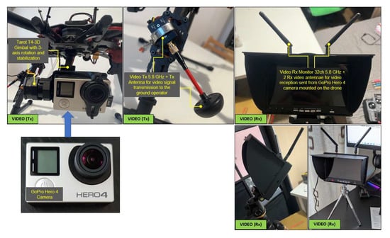 The video signal from the hexacopter is either stored on the GoPro camera’s internal microSD card (when it has to operate in record mode) or transmitted in real time to the ground by means of the following chain: the GoPro camera is connected to the Tarot T4-3D gimbal via a special dedicated connector; the video signal is then transmitted to a 32-channel antenna operating in the 5645–5945 MHz frequency range. This communicates with a dual receiver (two built-in antennas for better signal reception) on 32 channels, on the same frequency of 5.8 GHz, and the image is displayed on a 7″ HD monitor. Following laboratory tests, for optimal operation of the transceiver chain, the transmitter was set to channel 4 (5645 MHz), and the receiver was set to channel 5 (5885 MHz), according to the frequency matrices in the specifications of each component. Figure 8 illustrates the composition and location of the video transceiver system from the hexacopter to the operator. The HD video monitor with the built-in receiver is shown in the tripod-mounted version, but it can also be mounted on the operator’s radio remote control for easy observation of real-time images and gimbal control to obtain the desired frame during the surveillance, reconnaissance, investigation and shooting missions.
