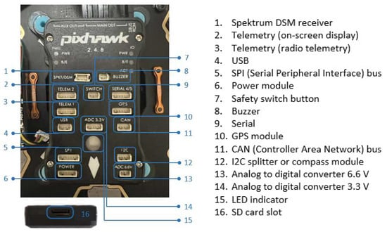 The Pixhawk 2.4.8 flight controller (FMUv2) installed on the hexacopter v2 version, with the interfaces to various peripheral equipment, are illustrated in Figure 9.