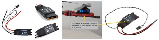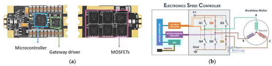The simplified diagram of ESC, depicted in Figure 10b, employs real-time operation. The main features and parameters of the ESC mounted on the hexacopter are as follows: it is equipped with specially optimized firmware for disc-type motors and a special core program for rapid throttle response, and the refresh rate of the throttle signal supported is up to 621 Hz, making the ESC perfectly compatible with various flight controllers (if the refresh rate is higher than 500 Hz, then the ESC control signal is the nonstandard throttle signal); it is equipped with driving efficiency technology (DEO), which effectively reduces the ESC operating temperature by about 20%, improves the flight time and brings a better throttle linearity and good stability—thus the operating efficiency improves by maximum 10%. In addition, its MOSFETs have extra-low resistance, offering high performance and great current endurance, with a continuous output current of 40 A and a burst of 60 A up to 10 s.