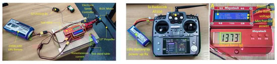To determine the thrust force, and therefore the efficiency of the propulsion system, laboratory tests were carried out using the Mayatech MT10PRO 10KG test stand. A Turnigy LiPo battery, 20,000 mAh capacity, 4 cells in 4S1P configuration, voltage 14.8 V, was employed to power the ESC–motor–propeller assembly. The Tx–Rx chain was provided by a 2.4 GHz radio remote control, model RadioLink AT10II, and a 12-channel receiver, model RadioLink R12DS. The test configuration is shown in Figure 12.