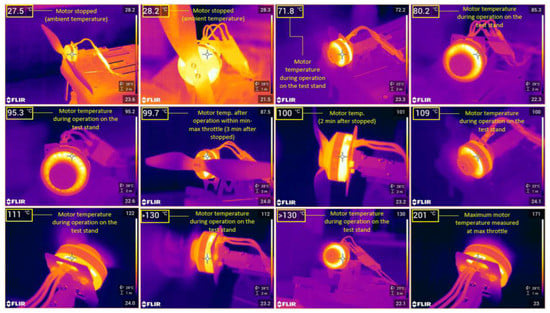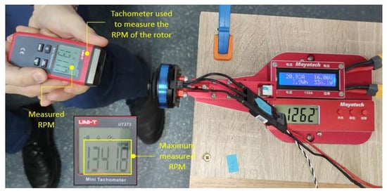 Using a tachometer, in the same test configuration, the maximum speed of the rotor assembly was determined, obtaining a maximum value of 13418 RPM (Figure 13).