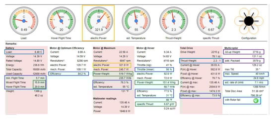 Delbecq et al. [40] presents a generic methodology that analyses the sizing aspect of the multicopter drones with electric propulsion, which allows configuration optimization for different applications. The study starts from a set of algebraic equations based on scaling laws and models that have resemblances. In the next phase, the optimization of the drone sizing is analysed through a proposed methodology. The obtained results are validated by comparing the characteristics of existing multirotors and performance predictions of these configurations which were performed taking into account different flight types and payload variants.