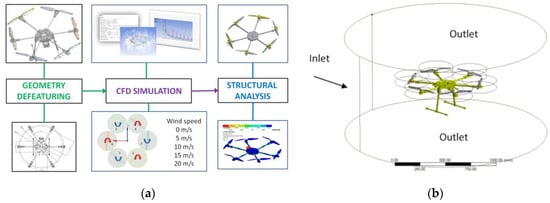 The design and development of a hexacopter capable of lifting a high payload has been investigated by Suprapto et al. [42] to ensure a stable attitude in flight. The evaluation focusses on the frame displacement and stress analysis to ensure the expected payload. In [85], experimental and CFD simulation tests for a small size UAV model to test wind influences at low speeds were reported. The study is comprehensive, but the prototype geometry as well as the flow regimes were found to be below the common level of UAV applications.