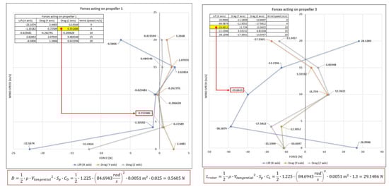 Reducing the drag force remains one of the main challenges in UAV aerodynamics research, as battery consumption can be significantly reduced if the drag decreases. Felismina et al. [83] analyse the aerodynamic behaviour of a quadcopter equipped with a seeding device in order to determine the appropriate bank angles (0°, 15° and 30°) for take-off and drone flight evolution during the seeding operation. Moreover, the work aims to define a suitable flight plan to increase the battery range. Aerodynamic results demonstrate that for take-off, the 30° tilt represents the most favourable aerodynamic position, due to the lower drag force that occurs during climb. In terms of the drone’s behaviour during seeding, the 0° tilt is the one that creates a lower frontal drag and a lower drag force coefficient, respectively.