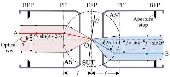 When the objective satisfies the Abbe sine condition, the plane wave passes through it and is converted into a convergent spherical wave. The spherical wave converges on the SUT at the focal point and re-enters the objective lens after it is reflected by the SUT. The position at which the beam re-enters the objective lens depends on the tilt angle of the measured surface. The rays reflected at the focal point O and at an angle α with respect to the central axis of the objective lens will be intercepted by AS’ at a distance f × sinα from the axis; they will then enter PP’ along the direction parallel to the central axis of the objective lens and emitted from the BFP’. As the aperture stop is usually placed on the BFP’, some beams reflected by the SUT cannot re-enter the optical path owing to the interception of the aperture stop when the inclination of the SUT is increased.