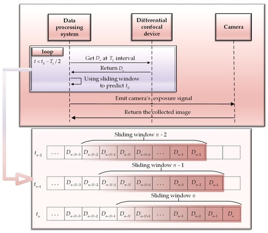 During the scanning process near the focal point, motion of this sensor can be approximated as uniform along the axial direction. The data acquisition board card collects a set of differential signals at intervals. As shown in Figure 3, at time , a group of differential signals is collected, and in the sliding window and its previous N groups of differential signals {, …,} are extracted. The workflow of the prediction of the zero-crossing time based on the sliding window concept is presented in Algorithm 1.