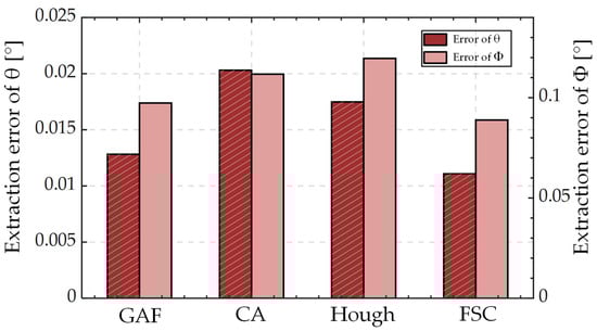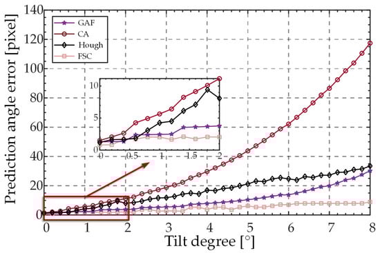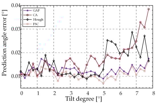 The prediction errors of tilt degree θ increase as a function of θ when the algorithm CA is used. When using FSC, GAF, and Hough, the prediction error values were in a relatively stable range when θ was less than 5°; errors progressively started to show an upward trend when θ > 5°. When predicting the tilt direction φ, the prediction error values of the four algorithms all exhibited a decreasing trend as a function of θ. For the prediction of θ and φ, the FSC performed better than the other three algorithms.